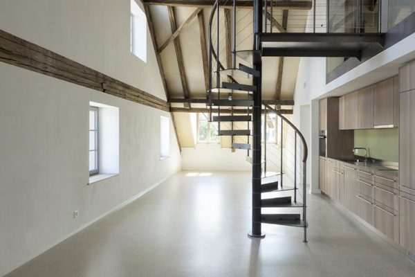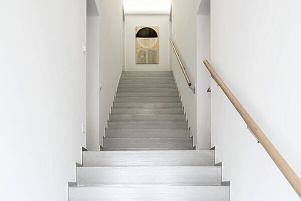 Das Projekt trägt den Namen Himmelsleiter, weil das Treppenhaus wie ein Tunnel, ohne Drehung nach oben Richtung Himmel führt. Die speziell materialisierte Treppe, Chromstahl matt, führt vom Aussenraum, über die Fassade (ca. 1.60 Meter ab Boden) in das Haus, womit die Wohnungen im 1. und 2. Obergeschoss erschlossen werden. Die Erdgeschosswohnungen sind direkt vom Aussenraum zugänglich.